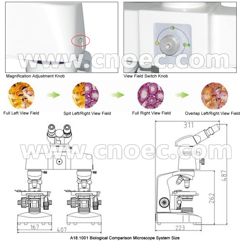 A18.1001 Biological Comparison Microscope, is used to analyze side-by-side specimens. It consists of two microscope connected to an optical bridge, which gives choice of 4 kinds observation view field: Full Left, Full Right, Split, and Overlapping Image. It is designed for identifying object's structure, comparing similarities and differences between specimens, such as pathological slides, biological slides and so on. It is an ideal instrument for teaching, biological and medical field.