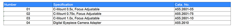 Adapter | C-Mount 0.5x, Focus Adjustable | ○ | ○ | A55.2601-05 |